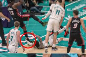 GIF-这动作不好!三球用手扒阿德巴约脚后跟致其倒地受伤,已回更衣室!