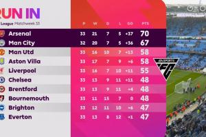 最后会是攻击力之争吗?枪手净胜球37曼城36,曼城少赛1场落后3分