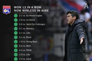 据TA统计,丰塞卡麾下的里昂此前取得13连胜,而2月中旬之后,里昂已经连续9场比赛不胜,战绩4平5负。