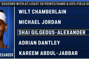 算上本赛季(场均31.3分,命中率55.4%),亚历山大生涯第四次赛季以50%以上命中率场均砍下30+,历史仅次于张伯伦的6次和乔丹的5次。