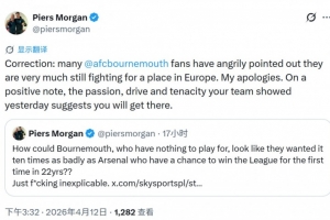 英国名嘴、阿森纳球迷摩根在社媒痛批枪手的表现,他表示无欲无求的伯恩茅斯比争冠的阿森纳展现出了更强烈的求胜欲望。