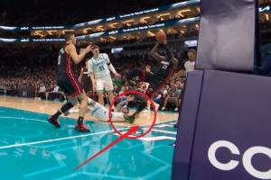 GIF-这动作不好!三球用手扒阿德巴约脚后跟致其倒地受伤,已回更衣室!